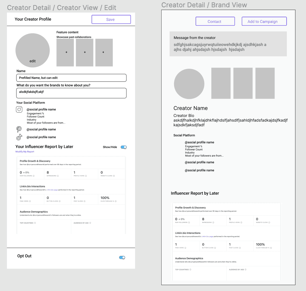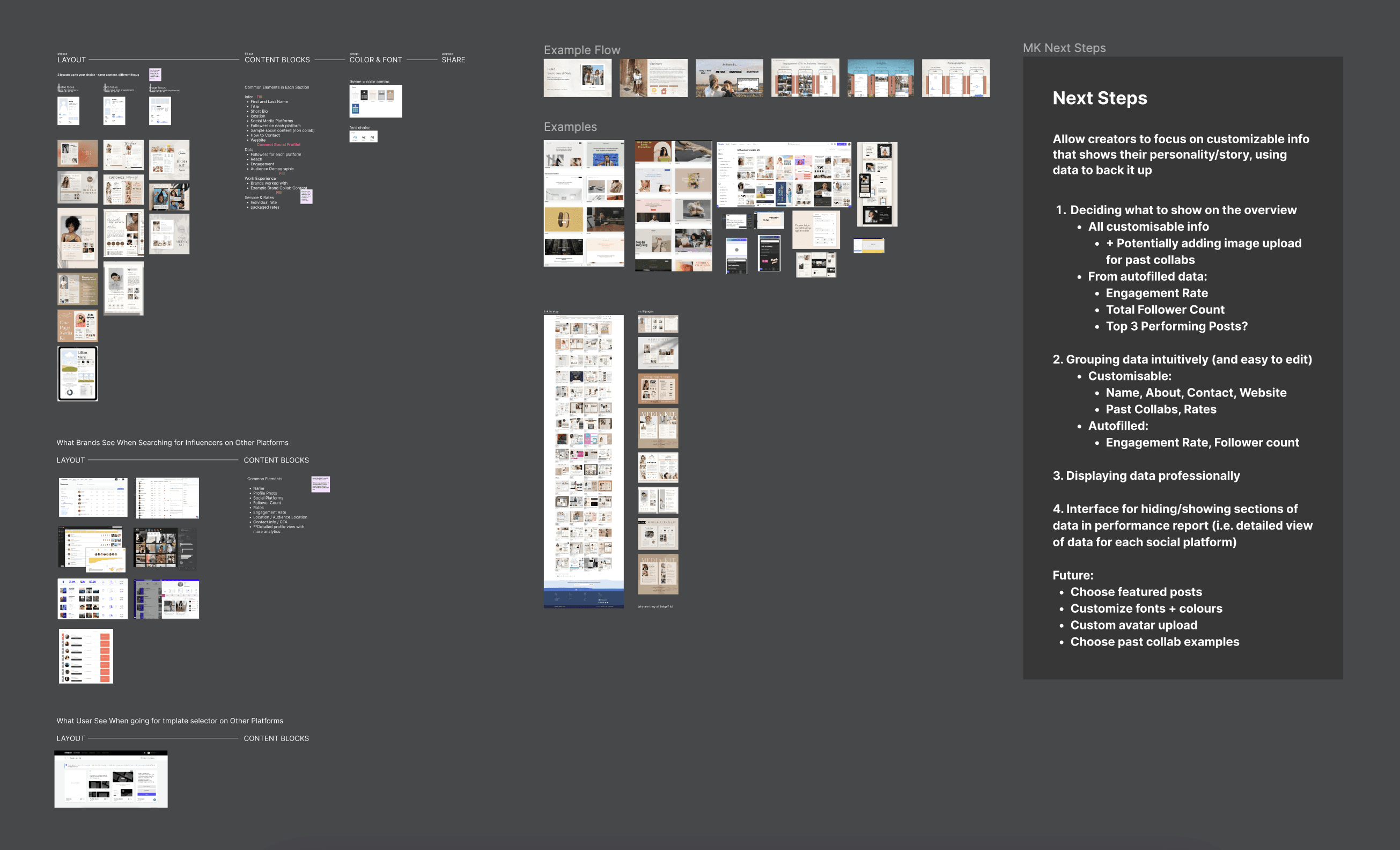 We compiled existing media kits and creator profiles, flows for building them, common features, and what brands see when searching for creators vs. expanding their profiles. This showed us which features and interaction patterns are expected as a baseline, informing our next steps for design.
