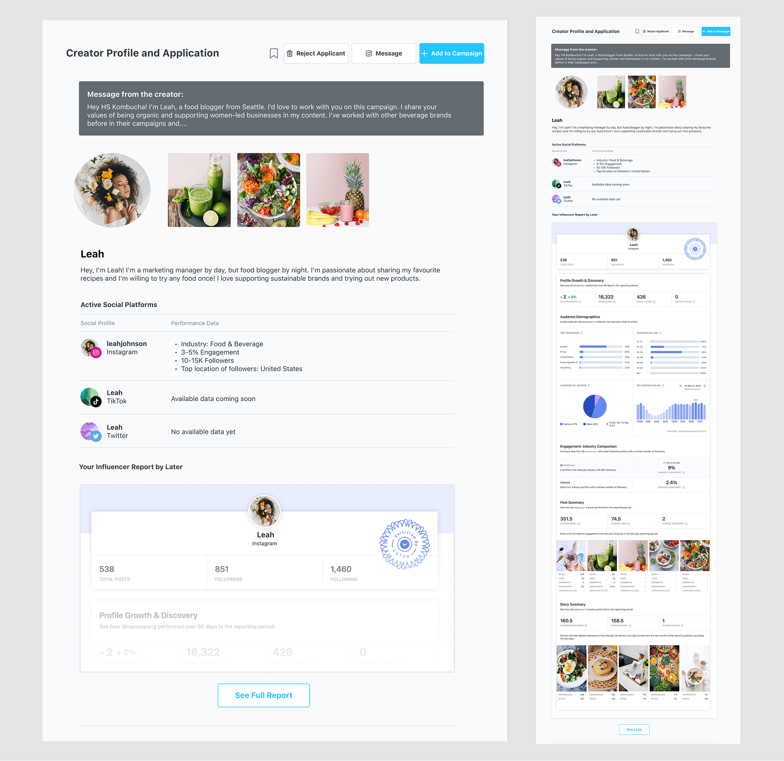 Customization is most important to creators – they want to show off their personality as well as impressive stats from past brand deals and featured posts. We aimed to balance giving creators options to customize, while providing verified data/reviews to maintain trust with brands.